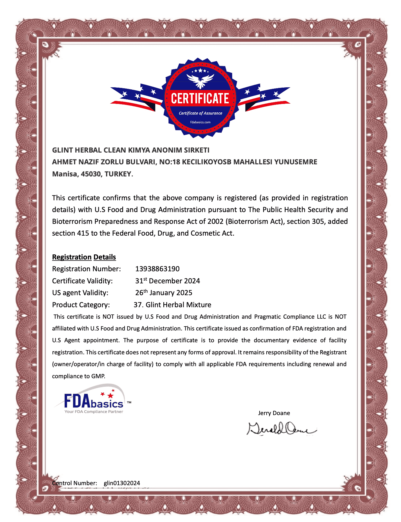 Înregistrare la FDA conform Public Health Security and Bioterrorism Preparedness and Response Act of 2002, secțiunea 305.