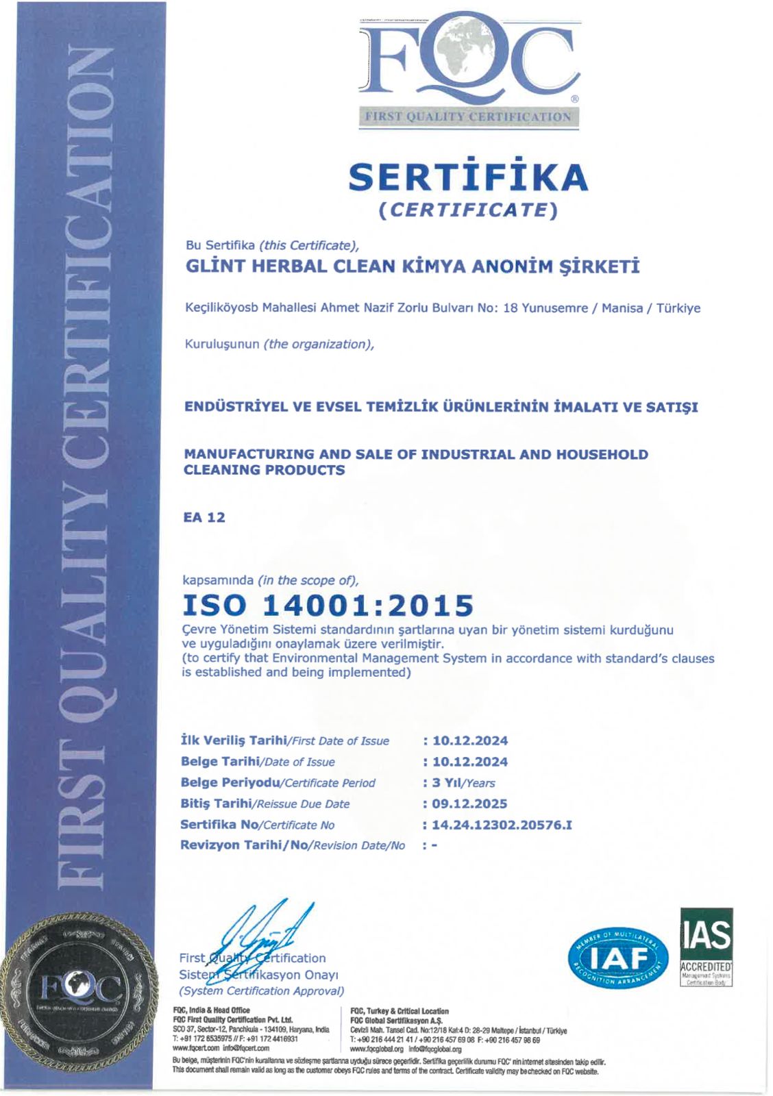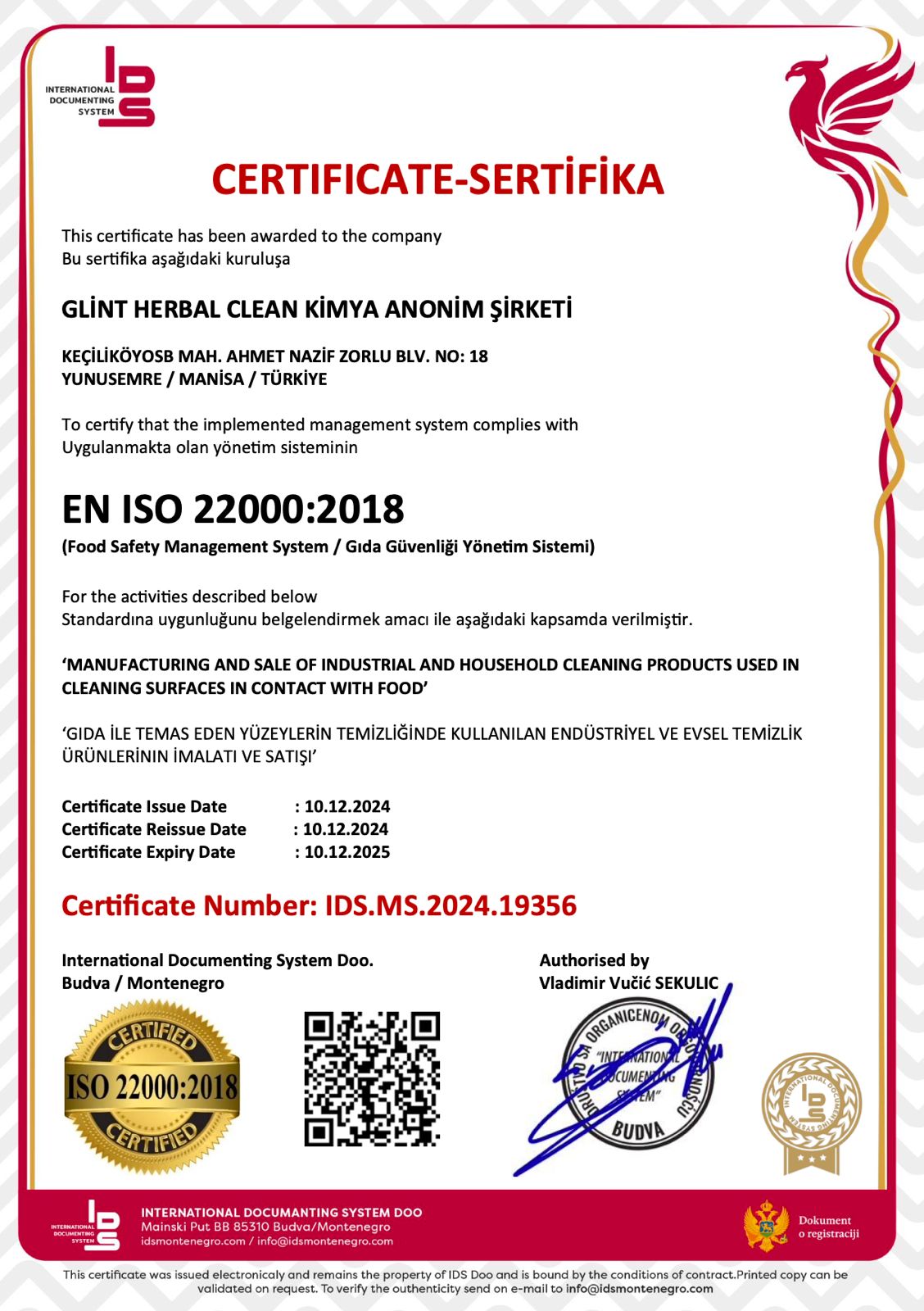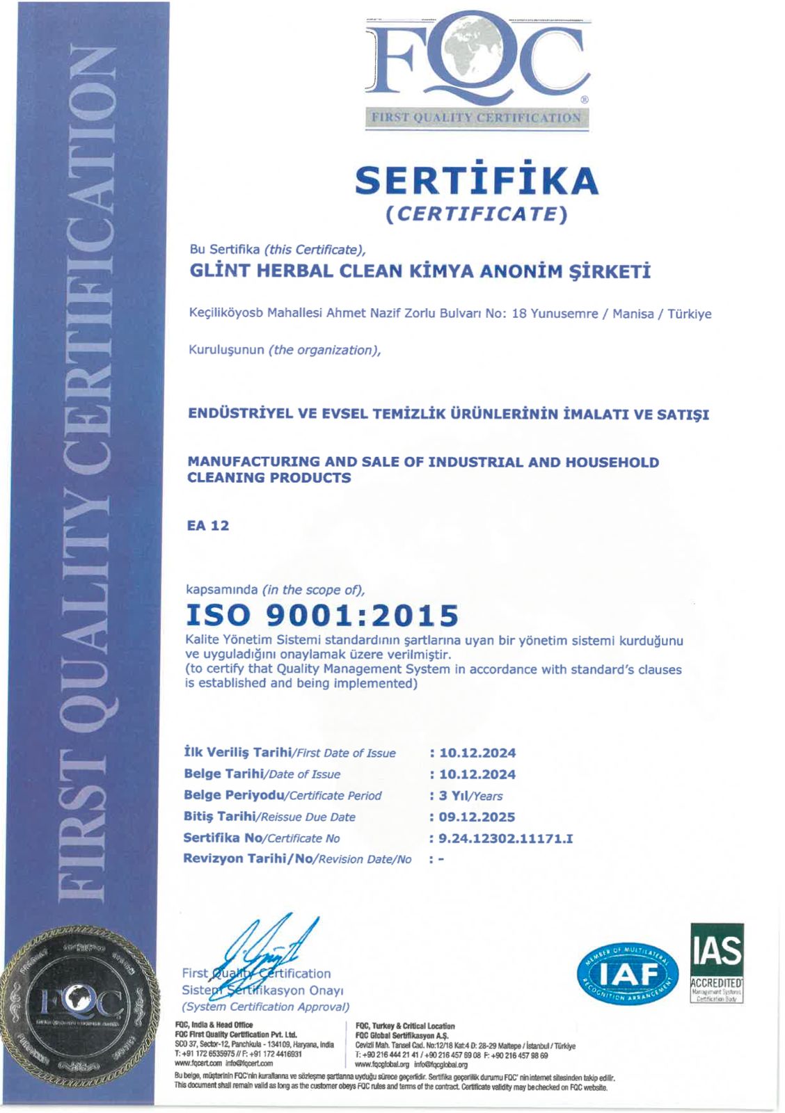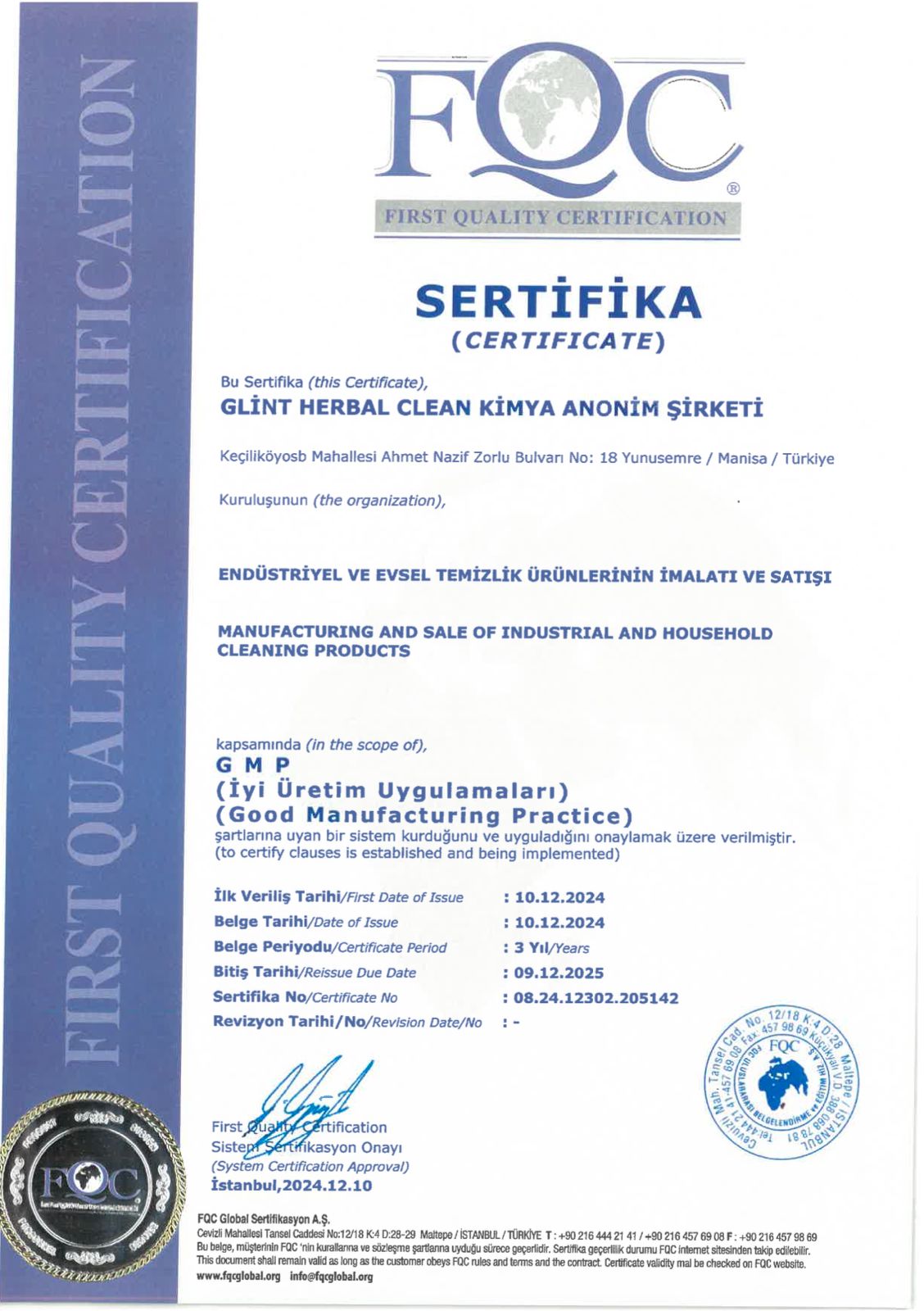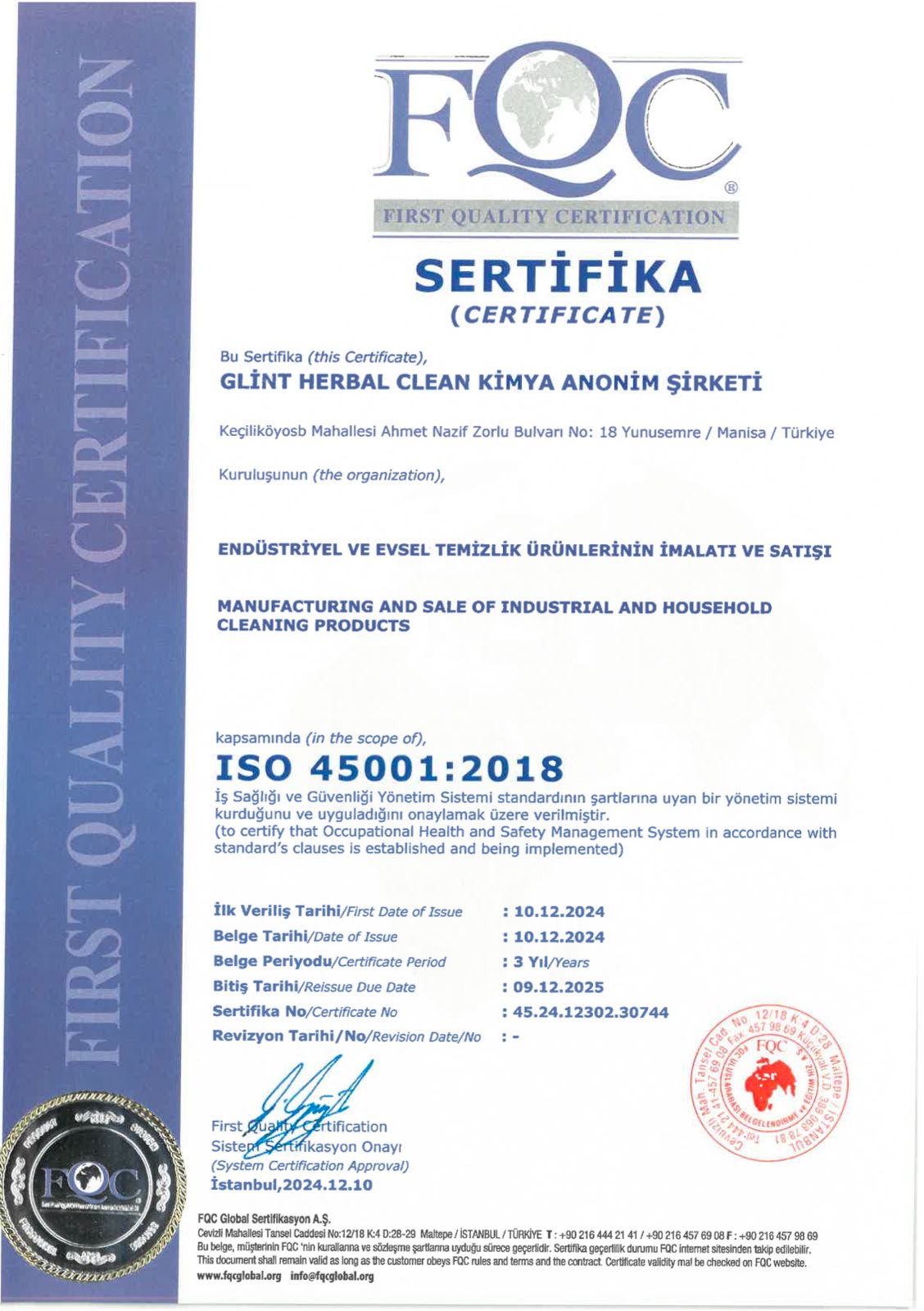 Certificat internațional de siguranță și calitate alimentară în Europa, emis după audit pentru produsele de curățenie Glint Herbal.