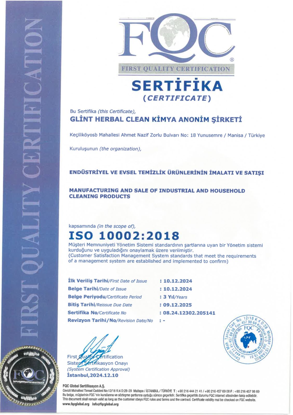 Sistem de management al calității pentru producția și vânzarea produselor de curățenie industriale și casnice.